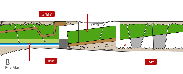 | 잔디광장(11,000㎡), 포장광장(3,600㎡), 실개천(L=130m, B=2m), 산책로(L=270m, B=3~4m) | |